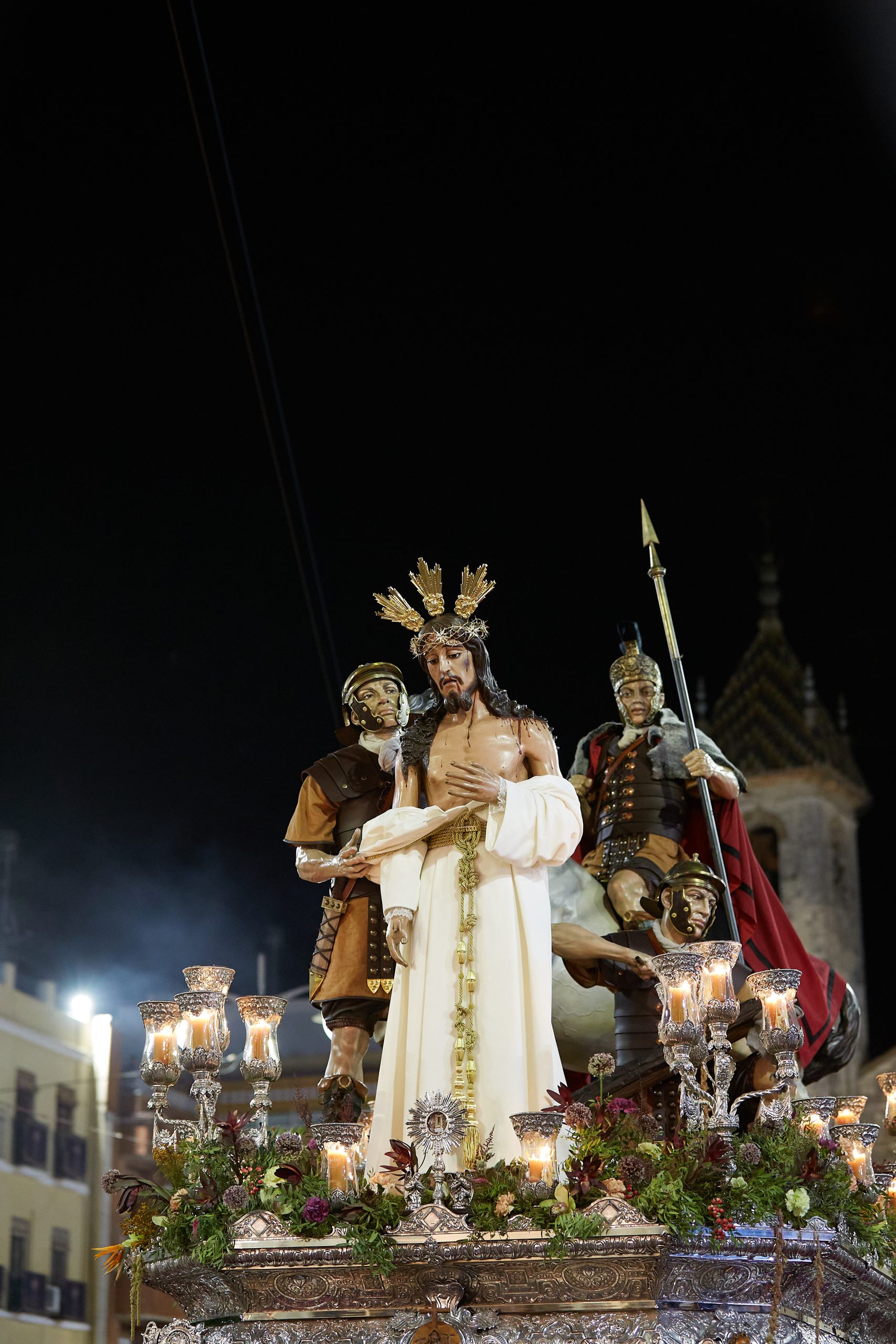 - Misterio de la Crucifixión (Pedro Muñoz de Toro – siglo XIX) – Le acompañan dos soldados romanos y un centurión a caballo obra de Francisco Javier López del Espino en 2024 – Trono de 28 santeros