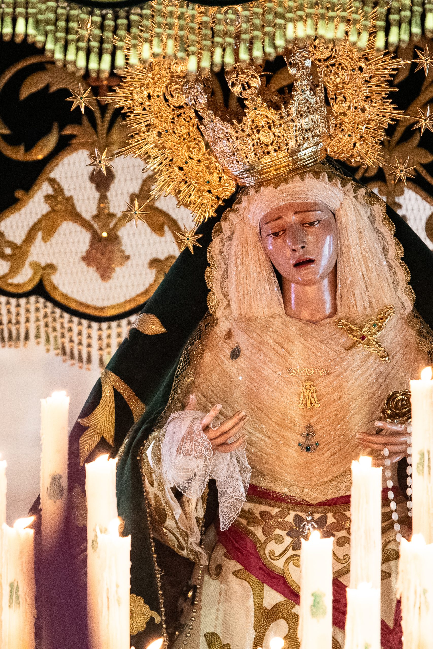 Con un tono de piel levemente moreno, la Virgen frunce delicadamente el ceño, mostrando una verdadera expresión de pesar en los ojos oscuros de los que parten tres lágrimas para surcar las comisuras de su carnoso rostro. Llaman poderosamente la atención sus labios rojizos y la grácil barbilla, aunque el principal elemento distintivo de la talla es la dulce forma en la que ladea su cabeza hacia el lado derecho. Cuenta con 165 centímetros de altura.
