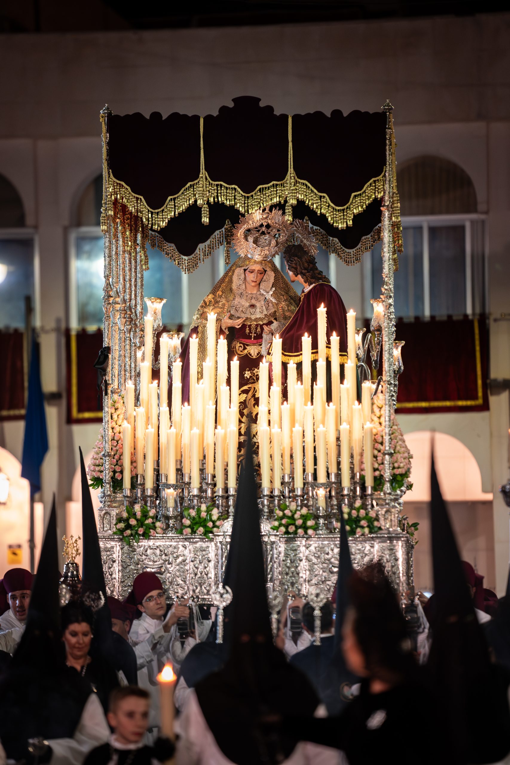Blanca y capirote negro (Cristo) y blanca y capirote granate (Virgen)