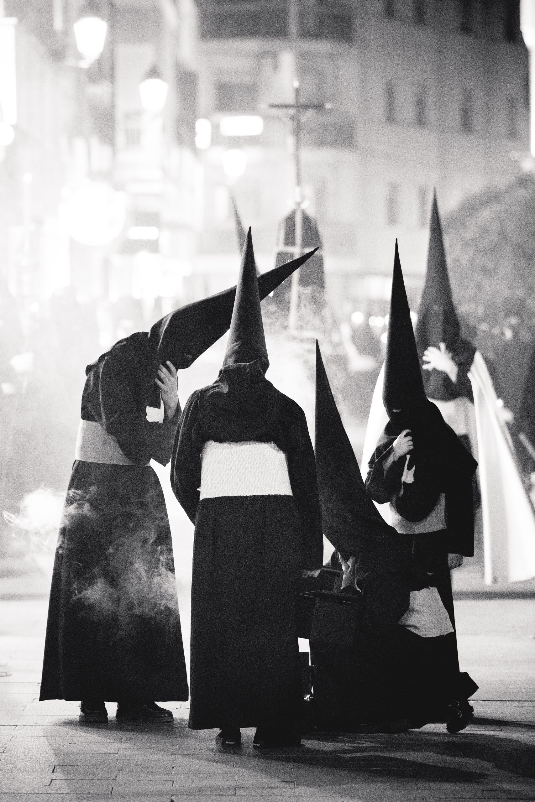 Negra con cinturón de esparto y antifaz también negro con la cruz de Malta.