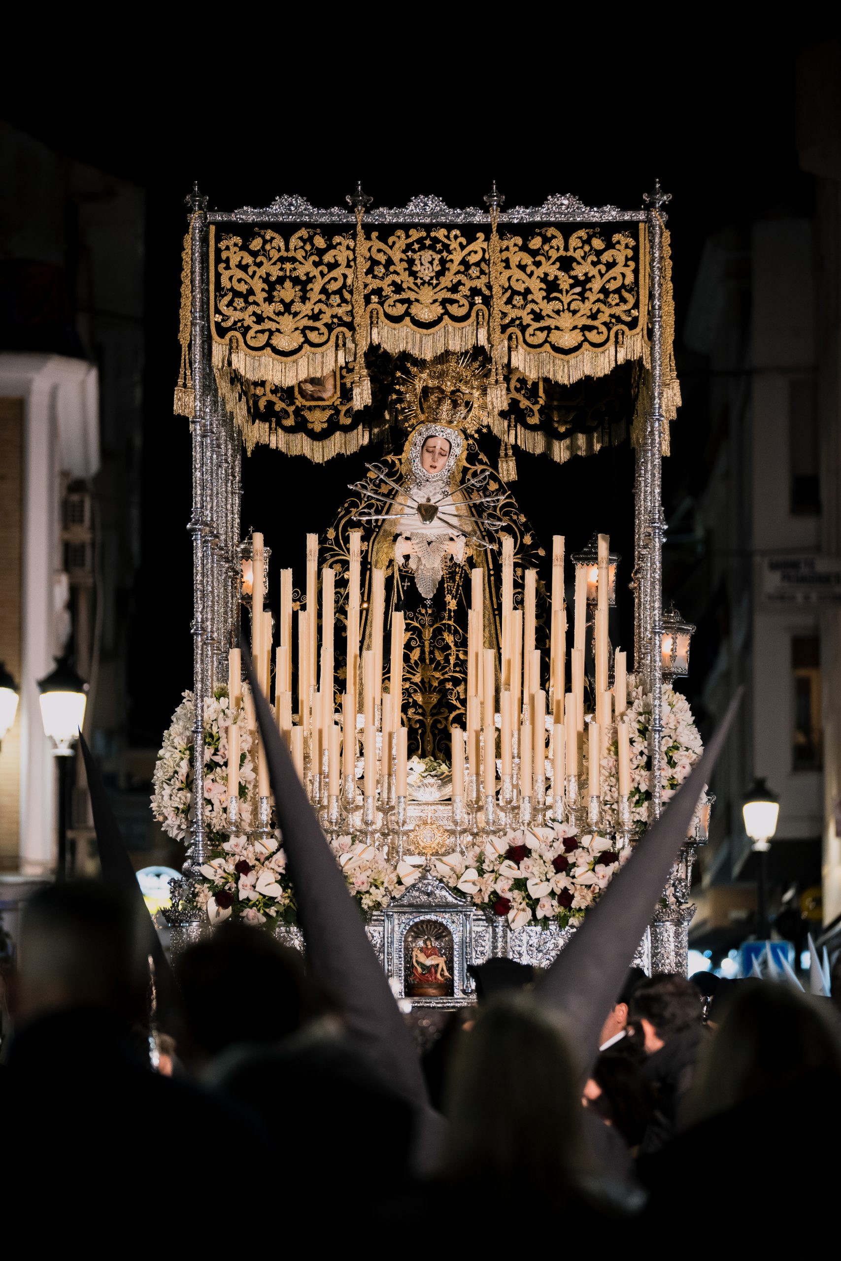 Su trono procesional fue adquirido en 1973 en los talleres de Angulo. Está realizado en metal plateado y repujado, con detalles dorados de ángeles querubines y medallones con motivos pasionistas en sus cuatro caras. Con motivo del cincuenta aniversario fundacional de la cofradía, en el año 2025 fue sometido a una profunda restauración, que incluyó la reparación y rediseño de numerosos elementos, así como el baño en oro de primera ley de la totalidad del conjunto. Los candelabros que hasta entonces completaban el trono fueron sustituidos por otros nuevos de diseño neobarroco, compuestos por un basamento cuadrado tallado del que emergen brazos inspirados en el cuerno de la abundancia, rematados por racimos de frutos que abrazan los guardabrisas. El juego, formado por seis piezas de diferentes tamaños, ha sido igualmente bañado en oro. Esta intervención fue realizada en los talleres de Orfebres Gradit, bajo la dirección artística de Antonio Budia Sabán, y ha sido sufragada casi en su totalidad gracias a las donaciones de un amplio número de hermanos.