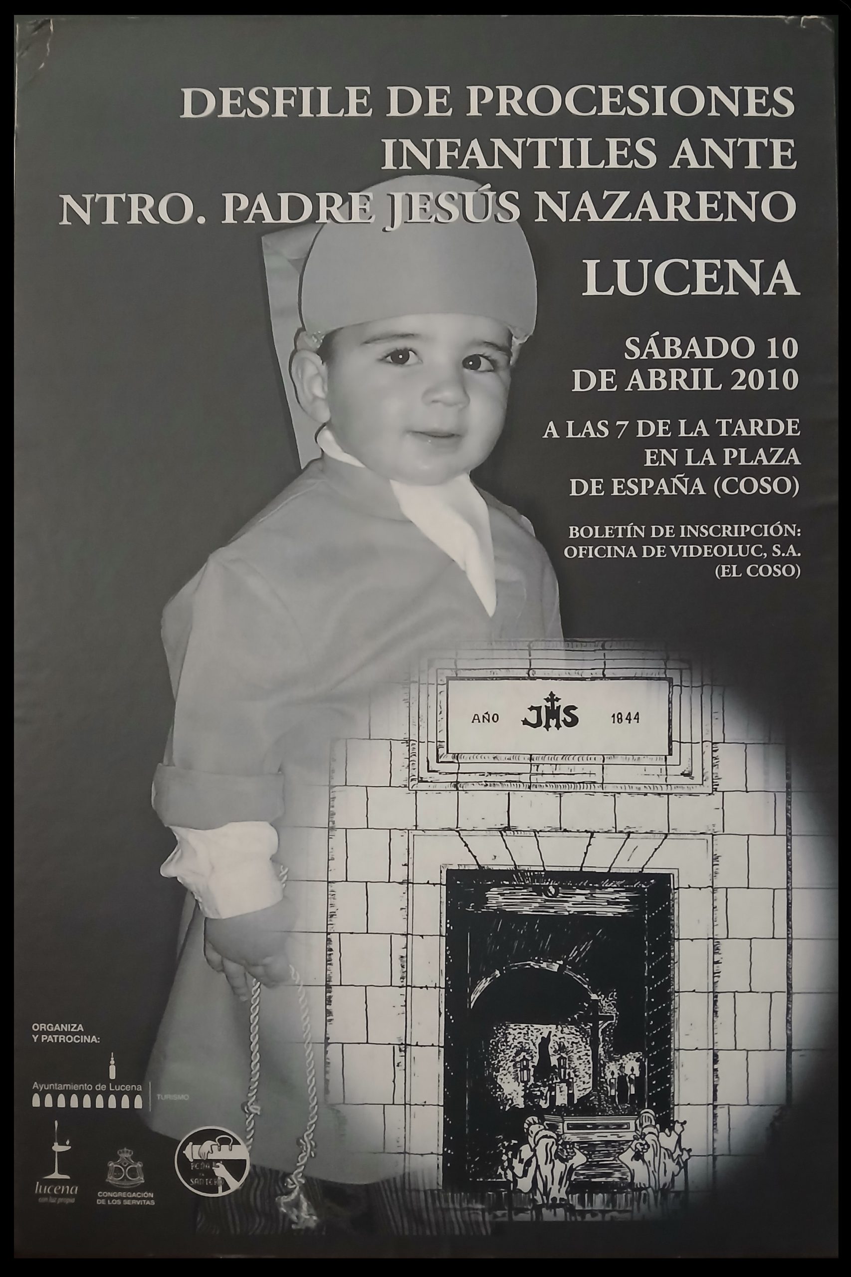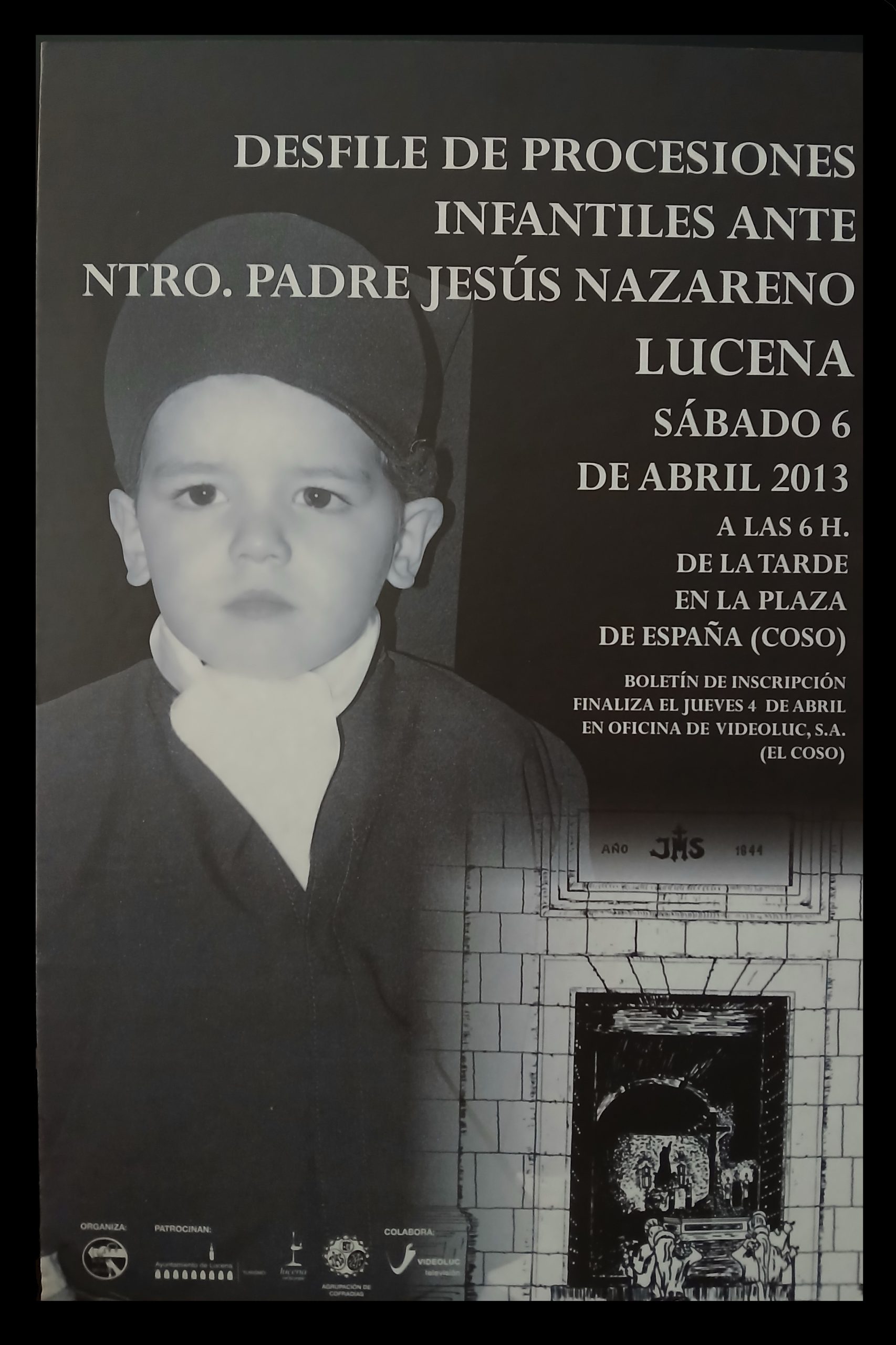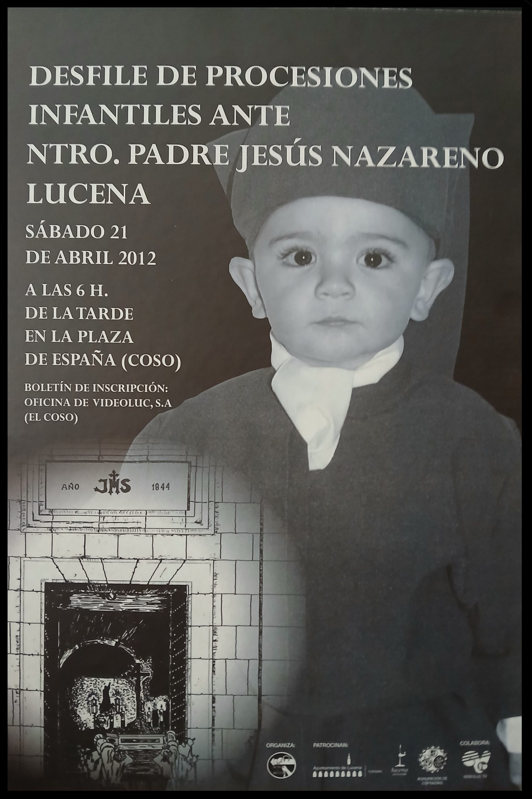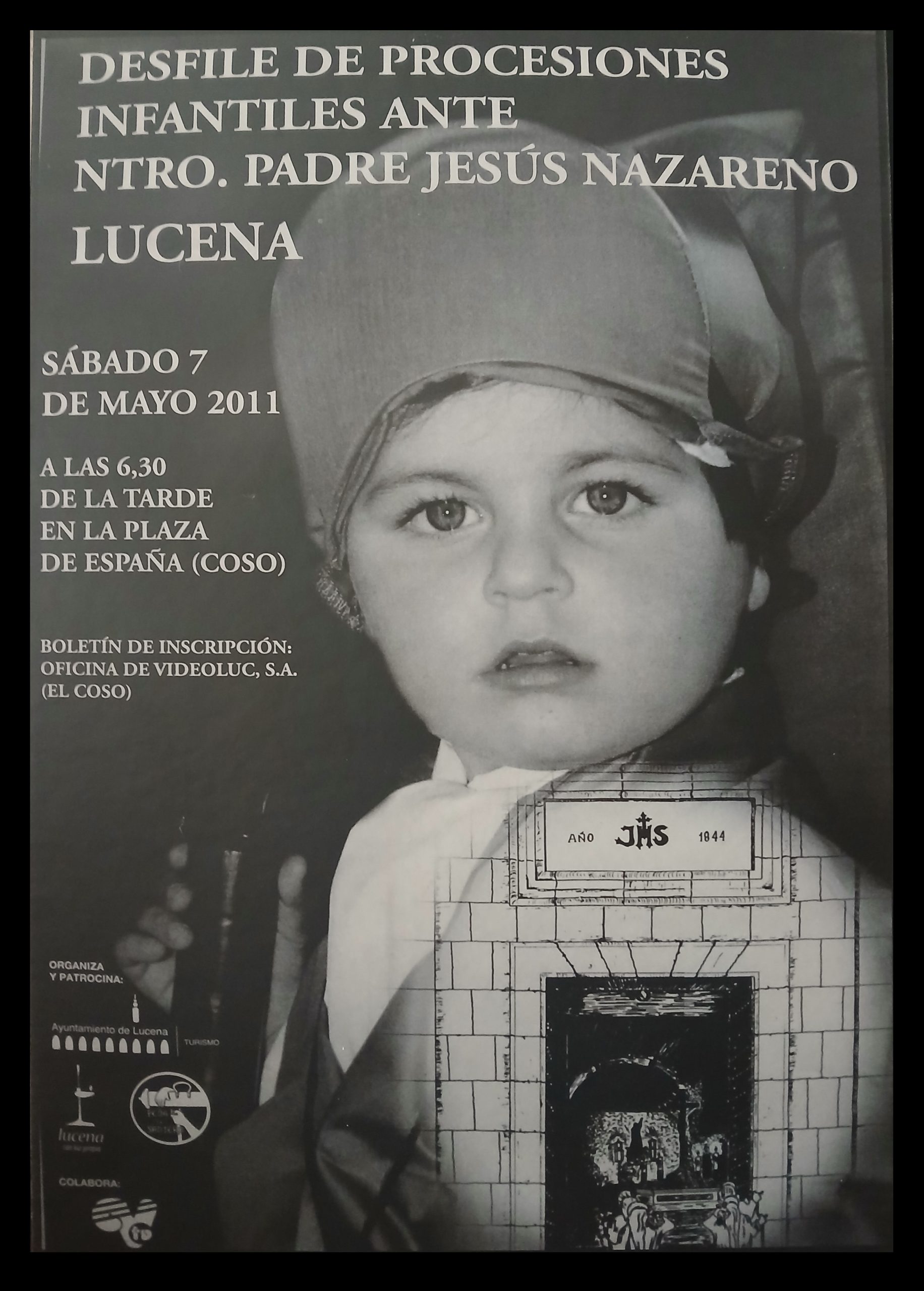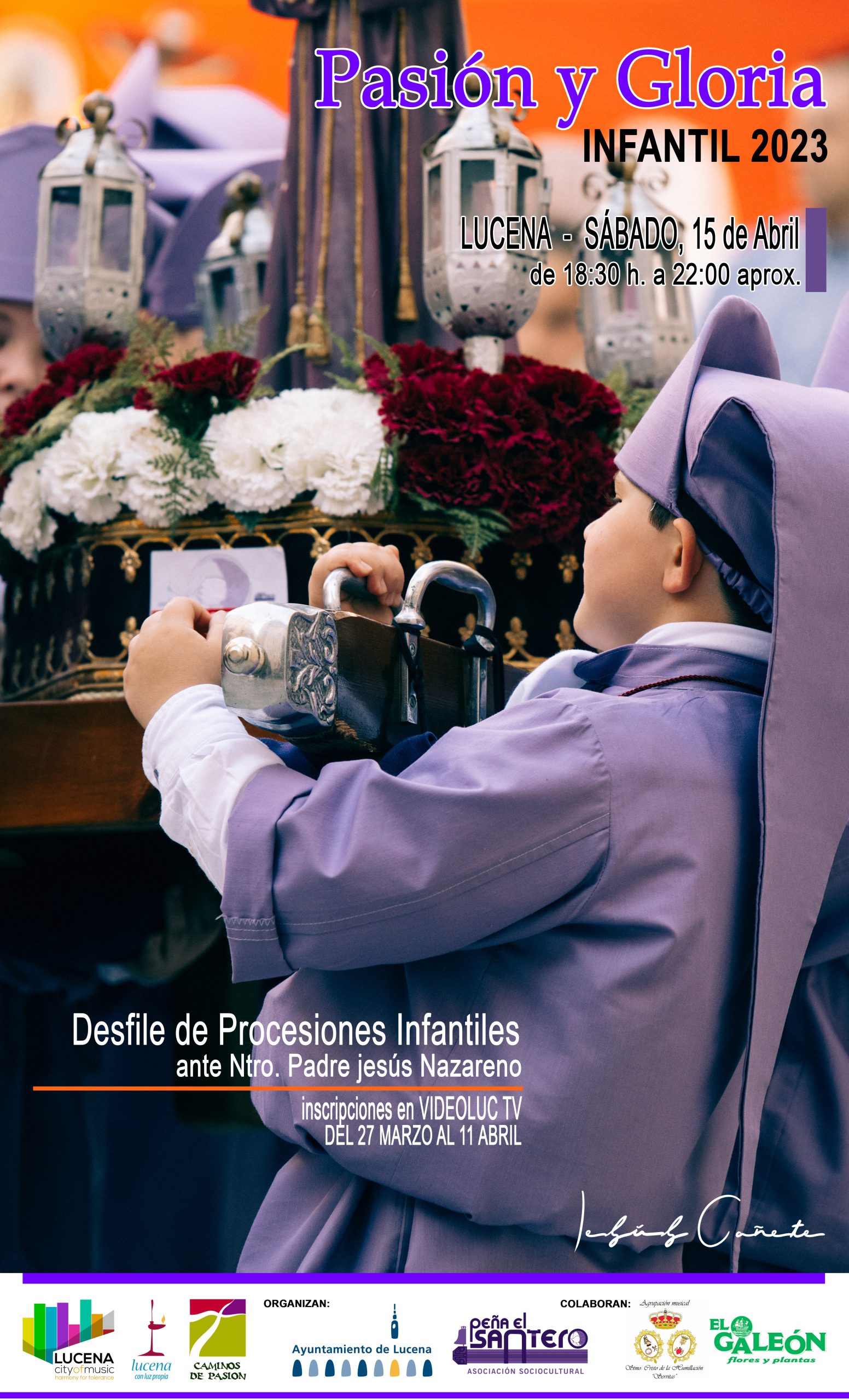 Su origen se remonta al siglo XIX, cuando en 1855 Lucena y otras poblaciones cercanas sufrieron una grave epidemia de cólera. Como medida preventiva, los niños reprodujeron en pequeños cortejos las procesiones de los mayores, germen de lo que hoy conocemos como Semana Santa Infantil. Aquella iniciativa espontánea fue calando en la vida local y, ya en 1973, la Agrupación de Cofradías decidió organizar oficialmente un Concurso de Procesiones Infantiles, otorgando a cada participante una medalla conmemorativa ilustrada con el cartel oficial de la Semana Santa de aquel año. Esta costumbre, lejos de perderse, se mantiene hasta la actualidad como un gesto simbólico de reconocimiento a todos los pequeños que participan.