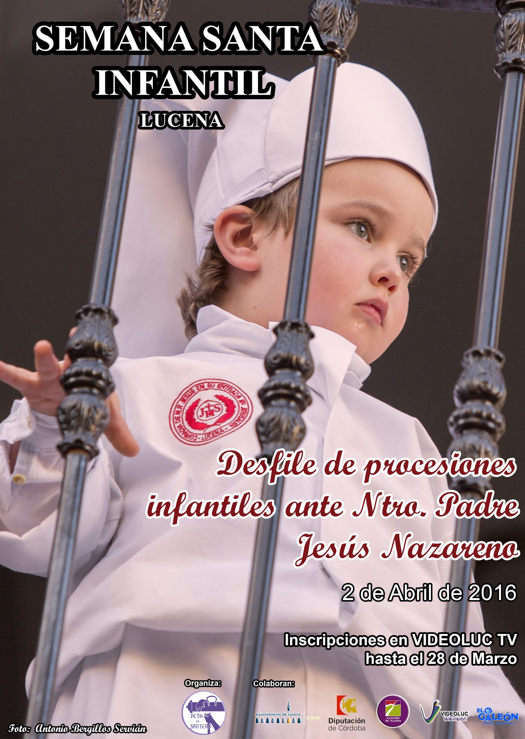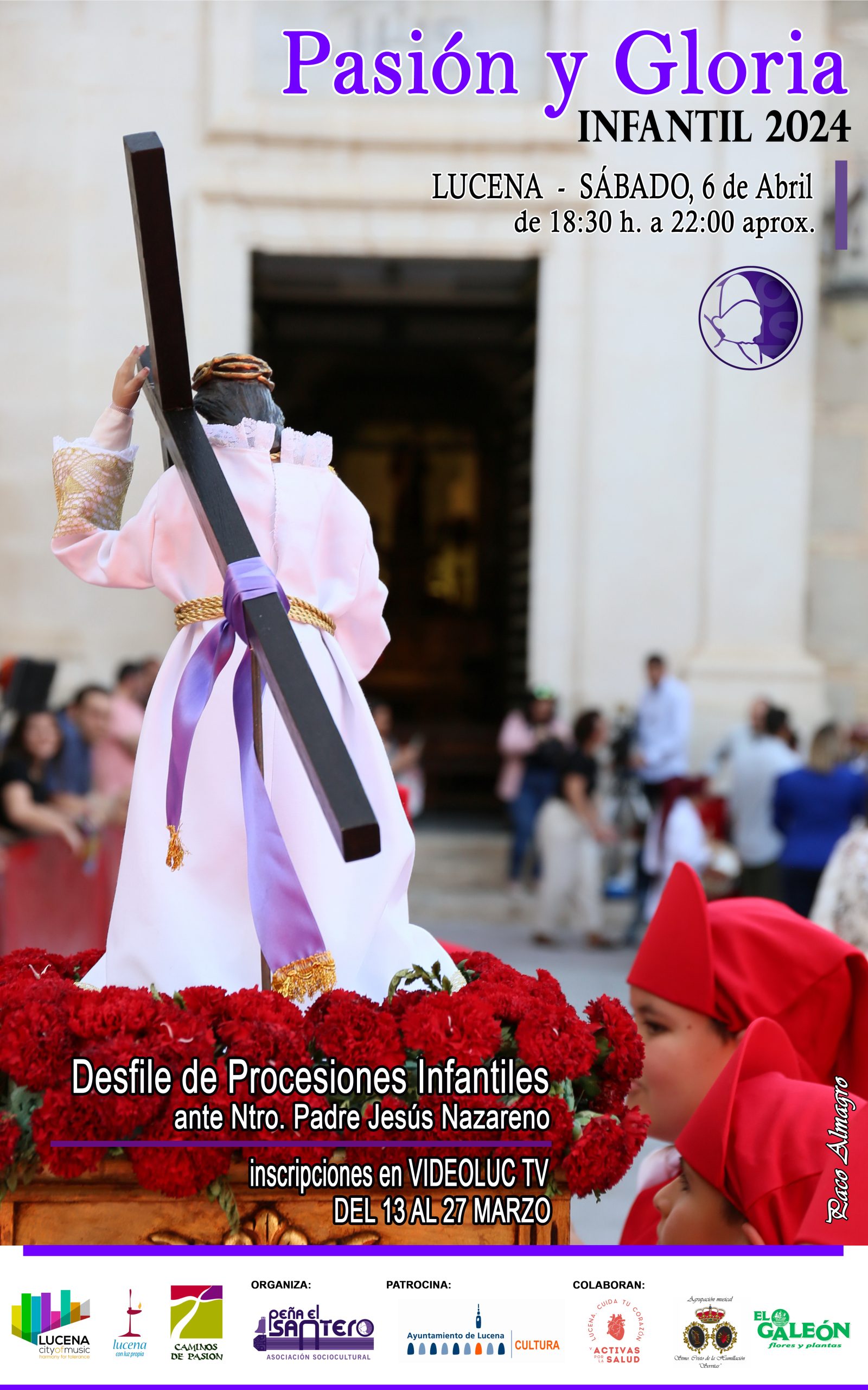 Cada año, más de un centenar de pasos procesionales infantiles, cuidadosamente elaborados, recorren las calles de Lucena portados a hombros por niños y niñas que reproducen la peculiar forma lucentina de procesionar: la santería. Con túnicas adaptadas a su talla, a cara descubierta y bajo la dirección de su propio manijero, los pequeños santeros imitan con precisión el movimiento característico de los tronos sobre el hombro, otorgándoles ese movimiento único que distingue a la Semana Santa lucentina. El cortejo lo completan niñas vestidas de mantilla, hermanos con sus insignias y tamboreros que marcan el ritmo del paso.